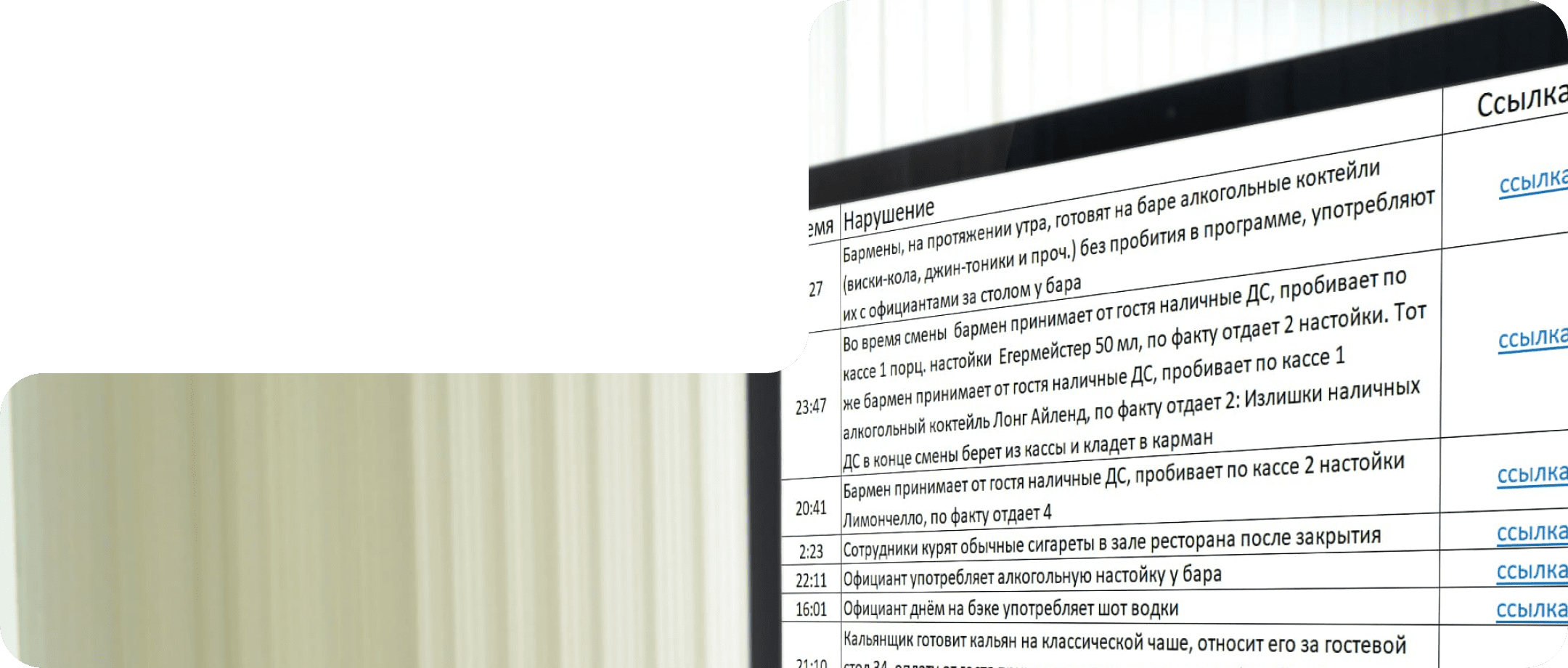 Контролируем фактическую реализацию напитков, блюд, кальянов и пресекаем продажи мимо кассы